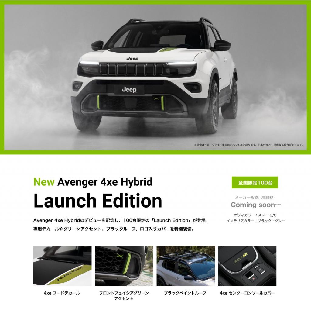 Avenger 4xe Hybrid Debutフェア開催! 2026年3月7日(土)~3月15日(日) 2026年3月5日、待望のAvenger 4xe Hybridが鮮烈デビュー。 街を自由に駆け抜けるコンパクトなサイズ感に、Jeepの遺伝子である4輪駆動の 走破性を凝縮。 最新の48Vハイブリッドが、日常を冒険へと変えていきます。 さらに100台限定のLaunch Editionも登場。 本物の自由を体現する一台が、今ここに。 またフェア開催期間中にご試乗いただいた方に …